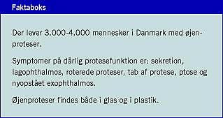 Der lever 3.000-4.000 øjenamputerede mennesker i Danmark. Denne artikel giver et overblik over, hvad man som læge skal være opmærksom på ved patienters øjenproteser. Der er ikke publiceret nogen evidensbaserede undersøgelser om emnet. Data i artiklen er hentet fra et igangværende ph.d.-projekt.