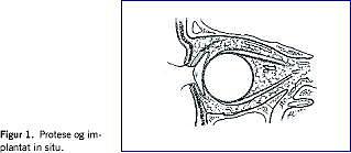 For at kompensere for volumentabet efter fjernelsen af øjet, indopereres der ofte et implantat. Implantatet er dækket af bindevæv og konjunktiva og er syet fast til rectusmusklerne. De implantater, der oftest benyttes i dag, er fremstillet af hydroxyapatit eller medpore. Bindevæv og blodkar vokser i løbet af ca. seks måneder ind i implantatets hulrum [3]. Ved enukleation omskedes implantatet ofte med syntetiske materialer [1, 2]. Protesen placeres i konjunktivalhulen og kan tages ud og ind af den efter behov [1, 2] (Figur 1).