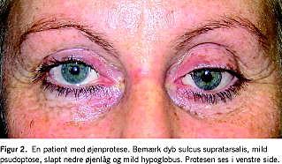 Det orbitale fedt på den opererede side atrofierer hurtigere end på den raske side. Derved synker protesen nedad og bagud. Man bemærker især den dybe markerede sulcus supratarsalis (Figur 2). Problemet kan delvist kompenseres ved at øge protesens tykkelse, men dette kan øge lagophthalmos, nedaddeplacering af protesen og risikoen for accidentalt protesetab. Behandlingen er kirurgisk.