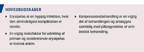Erysipelas er en hyppigt forekommende hudinfektion, der ses hos patienter i såvel primær- som sekundærsektoren. Behandlingen består af en kombination af antibiotisk behandling og ødembekæmpelse. Lave blodtryk på ankelniveau er ikke en kontraindikation for anvendelse af kompression, men en påmindelse om, at valget af kompression skal tilpasses denne kendsgerning. Elimination og behandling af risikofaktorer, herunder ødem, reducerer morbiditeten og risikoen for recidiv af erysipelas.