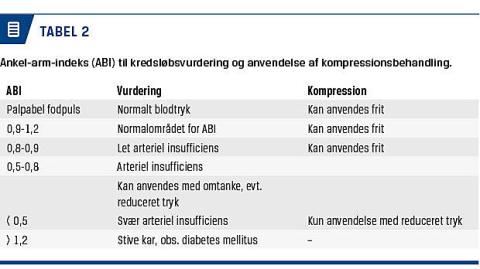 Er der ikke følelig puls på fodniveau, anbefales måling af det distale blodtryk forud for valg af kompressionsgrad. Tilstedeværelse af ødem vanskeliggør vurderingen af blodforsyningen på den erysipelasramte underekstremitet. Lave blodtryk på ankelniveau er ikke en kontraindikation for anvendelse af kompression, men en påmindelse om, at valget af kompression skal tilpasses denne kendsgerning. Ved fund af lave blodtryk på ankelniveau (≤ 45 mmHg) simultant med sår eller hudproblemer skal der altid henvises til karkirurgisk vurdering. Undersøgelse af det systoliske blodtryk på ankelniveau kan bidrage til at vælge det korrekte kompressionstryk og den rigtige bandage (Tabel 2). Blodtrykket kvantificeres ved hjælp af Doppler-UL-skanning samt et ankel-brakial-indeks: højeste ankel-systolisk tryk/højeste arm-systolisk tryk [20].