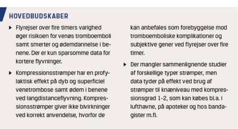 Vi konkluderer, at kompressionsstrømper kan anvendes som profylakse selv ved lav risiko for venøs tromboemboli. Kompressionsstrømper har en påvist risikoreduktion ved flyrejser over fire timer, er billige og har ingen bivirkninger ved korrekt brug. Der mangler data for brug af kompressionsstrømper på flyrejser under fire timer. Der kan derfor argumenteres for, at alle passagerer med fordel kan anvende kompressionsstrømper ved flyrejse, i hvert fald ved flyvning på over fire timers varighed.