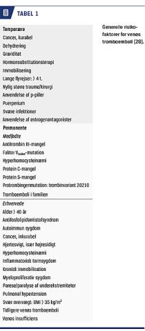 Selvom det er biologisk plausibelt, at særlige forhold under flyrejser øger risikoen for venøs tromboemboli, er det ikke endegyldigt påvist, at flyrejse medfører større risiko end andre rejseformer [2]. Der er til gengæld påvist en kraftigere synergistisk effekt mellem flyvning og endogene risikofaktorer end ved andre rejsemåder [2, 5]. En mulig forklaring kan være, at venøs tromboemboli er en multikausal sygdom, som afhænger af både endogene risikofaktorer og risikofaktorer i relation til rejse og kabinemiljø. Der er identificeret en række faktorer, som særligt øger risikoen for venøs tromboemboli under flyrejser. Disse er trombofili, specielt faktor VLeiden-mutation [2, 5], brug af perorale kontraceptiva [2, 3, 5] højt body mass index (BMI) [2, 3, 23] og højde over 190 cm eller under 160 cm [2, 3]. Det kan tænkes, at særligt høje mennesker er specielt immobiliserede pga. relativt trang benplads, og at lave personer har en særligt uhensigtsmæssig siddestilling, idet sædekanten trykker kraftigere på de dybe vener, hvis fødderne ikke når gulvet. En lang række faktorer er kendt for at øge risikoen for venøs tromboemboli generelt (Tabel 1), men selvom ikke alle faktorer under flyrejse er lige godt belyst, antages det, at disse generelle faktorer også øger risikoen under flyvning.