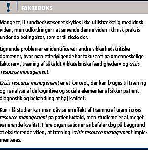 I flere internationale og et dansk studie har man påvist, at utilsigtede hændelser ses ved ca. 9% af alle indlæggelser [1, 2]. I de seneste ti år har der været en stigende interesse for at lære af sådanne hændelser for at forbedre patientsikkerheden. Undersøgelser viser, at mange af disse hændelser kan tillægges menneskelige fejl [3]. Årsagerne er således ikke utilstrækkelig medicinsk viden, men udfordringer i at anvende denne viden i klinisk praksis under de betingelser, som er til stede der [4]. Et centralt begreb er »menneskelige faktorer«, som her defineres som samspillet mellem menneske og omverden. En af grundtankerne er, at fejl i praksis er uundgåelige i komplekse omgivelser, hvor individet interagerer med andre individer og med teknologi [5]. I visse højrisikoorganisationer, såsom luftfarten og atomkraftindustrien, har man på baggrund af analyser af hændelser udviklet og implementeret initiativer til at forebygge menneskelige fejl, herunder træning af crisis resource management (CRM).