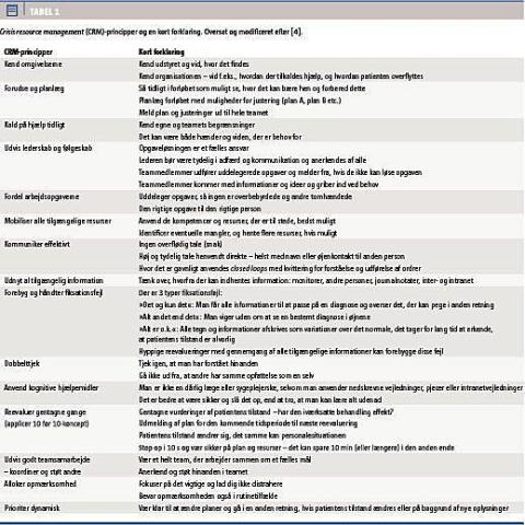 CRM i sundhedsvæsenet består af træning i adfærdsprincipper, der lader klinikere agere i den komplekse og dynamiske virkelighed, som den kliniske praksis udgør med dens indbyggede usikkerhed, tidspres samt kulturelle og organisatoriske normer [4]. Målet er at udnytte alle tilgængelige resurser samt forebygge og mindske effekten af fejl og herigennem i sidste ende øge patientsikkerheden og kvaliteten i behandlingen. CRM-træning kan dog ikke stå alene, men bør altid følges af høj medicinsk faglig kompetence. En forklaring af principperne kan ses i (Tabel 1); for en mere detaljeret beskrivelse se [4]. De fleste af principperne vedrører individet, mens enkelte er møntet på teamet som helhed. Flere er tæt forbundne. Nogle principper er relateret til sociale aspekter, såsom god kommunikation og godt teamsamarbejde, mens andre kan henføres til kognitive funktioner, såsom at allokere opmærksomhed klogt. Principperne er udviklet med det formål at øge individets og teamets evne til at forebygge og håndtere fejl, som ikke kan fanges igennem effektivt systemdesign eller andre beskyttende barrierer. Principperne støtter sundhedspersonalet i at se verden gennem »patientsikkerhedsbriller«.