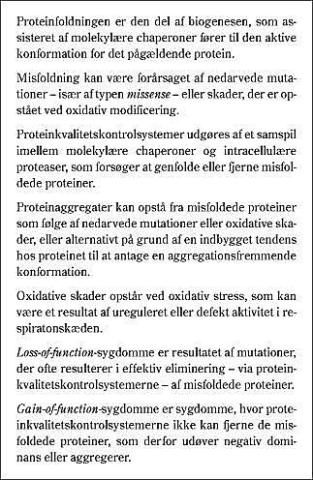 Disse mekanismer er vigtige for forståelsen af opståen og progression af den type konformationssygdomme, som involverer proteiner med indbygget tendens til at ændre konformation og aggregere (se nedenfor) (8). Da produktionen af fejlfoldede og oxidativt modificerede proteiner øges med alderen (10, 23, 24) vil cellens kapacitet til oprydning (dam-age control ) svækkes. Uanset at ekspressionen af flere chaperoner formentlig øges med alderen hos mennesker, som det er tilfældet hos mus (25), er uopf yldte krav til cellens proteinkvalitetskontrolsystemer sandsynligvis medvirkende årsag til patogenesen hos patienter med typiske alderdomsygdomme som Alzheimers, Parkinsons og Huntingtons sygdomme.