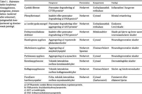 Konformationssygdomme er betegnelsen på en blandet gruppe af sygdomme, hvor patogenesen skyldes fejlfoldning af cellulære proteiner. Den normale aktive konformation af proteinerne kan ikke opnås, og på grund af det fejlfoldede protein udvikles forskellige typer sygdomsbilleder, som eksemplificeret i Tabel 1 . En vigtig type er genetiske sygdomme, hvor et fejlfoldet protein ikke kan opnå den funktionelle struktur eller foldes så dårligt, at det hurtigt nedbrydes (1-3). Typiske eksempler på sådanne loss of function -sygdomme er recessivt nedarvede sygdomme, såsom cystisk fibrose (4), α-1-antitrypsin-mangel (5), fenylketonuri (PKU) (6) og fedtsyreoxidationsdefekter (7).