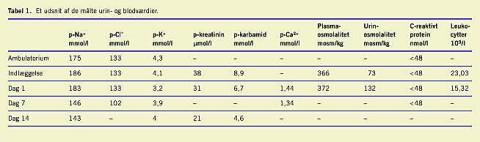 Resultaterne af blodprøverne fremgår af Tabel 1 . Der var overraskende en meget høj p-Na (= 175 mmol/l), som sammen med let forhøjet p-carbamid (= 8,9 mmol/l) indikerede svær hyperton dehydrering. Samstemmende måltes efterfølgende stærkt forhøjet plasmaosmolalitet (= 366 mosm/kg). Der blev anlagt et blærekateter, og urinosmolalitet blev målt til 73 mosm/kg, u-Na til 10 mmol/l, mens timediuresen var 48 ml svarende til 189 ml/kg/døgn. Døgnurinopsamling viste polyuri (154 ml/kg/døgn) og dårligt koncentreret urin (132 mosm/kg), hvilket bekræftede diagnosen. Der blev givet 1 μ g desmopressin intravenøst × 4 daglig uden effekt på diurese eller urinosmolalitet. Basal p-antidiuretisk hormon var høj (24 pg/ml).