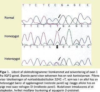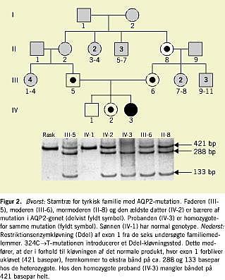 Ved ultralydskanning af cerebrum, nyrer og urinveje fandt man intet abnormt. Desuden blev adrenokortikotropt hormon, T3, T4, TSH, renin, cortisol, prolactin og toxoplasmose, other agents , rubella, cytomegalovirus og herpestitre kontrolleret; alle var normale. Fravær af symptomer hos forældrene udelukkede med stor sandsynlighed en mutation i AVPR2-genet, idet denne nedarves X-bunden recessivt. Yderligere tydede oplysningen om forældrenes konsangvinitet på en autosomal recessiv arvegang og dermed en mutation i AQP2-genet [6]. Vi foretog derfor sekvensanalyse af AQP2-genet ud fra genomisk DNA oprenset fra etylendiamintetraacetatblod. Denne analyse viste, at pigen var homozygot for en punktmutation i AQP2-genet (324C→T). Mutationen introducerer et præmaturt stopkodon, hvilket medfører trunkering af aquaporin 2-proteinet [4] (Figur 1 ). Mutationen blev bekræftet i et restriktionsenzymassay (Figur 2 ). Efterfølgende undersøgtes pigens to søskende, forældrene og mormoderen (Figur 2). De havde normal urinkoncentrationsevne og alle fandtes heterozygote for mutationen undtagen pigens bror (IV-1), som havde normal genotype (Figur 1 og Figur 2).