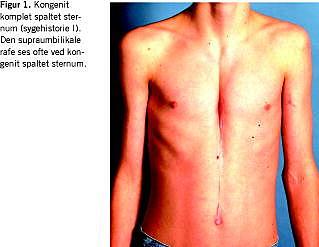 Kongenit spaltet sternum (KSS) blev første gang beskrevet i 1740 [1, 2], og den første kirurgiske korrektion blev foretaget i 1888 [1]. KSS kan inddeles i tre grupper [3, 4]: partiel spaltning af øvre del af sternum, hvilket sjældent er ledsaget af andre misdannelser, partiel spaltning af nedre del af sternum og totalt spaltet sternum, hvilke kan være associerede med hjertemisdannelser [2-4] herunder Cantrells pentalogi (misdannelse af sternum, hjerte, pericardium, diafragma og abdominalvæg), midtlinjedefekter [1, 2, 4] og hæmangiomer [2-4].