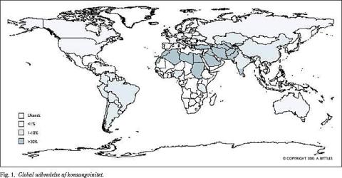 Verdensbefolkningen kan i store træk opdeles i fire grupper afhængig af konsangvinitetsfrekvensen (Fig. 1 ) (3); således findes en frekvens på <1% hos 1.061 mio., på 1-10% hos 2.811 mio., på 20-40% hos 991 mio., mens frekvensen hos 1.064 millioner er ukendt (4).
