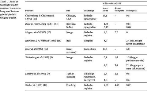 Denne øgede relative risiko for konsangvine i forhold til ikkekonsangvine for at få børn med medfødte misdannelser kan genfindes i flere studier (Tabel 1 ). Man ser, at riskoen for at få børn med medfødte misdannelser gennemgående er fundet at være ca. 2 1/2 gange højere for konsangvine end for ikkekonsangvine. Det er desuden vist, at incidensen af malformationer er højere for børn af onkel-niece-forældre (9,34%) end for børn af fætter-kusine-forældre (6,18%) (9). Stoltenberg et al har i et andet studie estimeret og sammenlignet gentagelsesrisikoen af medfødte misdannelser for børn født af henholdsvis konsangvine og ikkekonsangvine forældre (19). For ikkekonsangvine forældre, hvis foregående barn havde en medfødt misdannelse, fandtes en gentagelsesrisiko på 33 pr. 1.000 fødsler (mod 15 pr. 1.000, hvis det forudgående barn ikke var misdannet). For konsangvine forældre var gentagelsesrisikoen på 68 pr. 1.000 fødsler (mod 36 pr. 1.000, hvis det foregående barn ikke var misdannet). Den øgede gentagelsesrisiko for konsangvine er dog ikke signifikant forskellig fra gentagelsesrisikoen for de ikkekonsangvine, formentlig betinget af den beskedne studiegruppe og en formodet underrapportering af konsangvinitet.