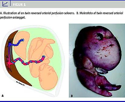 Karakteristisk for syndromet er, at en strukturelt normal tvilling via superficielle placentære anastomoser holder en akardiel tvilling i live. Via disse anastomoser flyder arterielt blod retrogradt fra den pumpende tvilling til den akardielle tvillings umbilikalarterier (Figur 1 A). Et TRAP-syndrom er altid letalt for den akardielle tvilling, og for den pumpende tvilling er syndromet associeret med en perinatal mortalitet på 35-50%, hovedsagelig pga. polyhydramnion, præterm fødsel og morbus cordis opstået på baggrund af de øgede hæmodynamiske krav til den pumpende tvilling [1, 2].