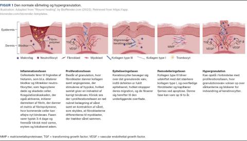 Granulationsvæv er essentielt i den proliferative fase af den normale sårheling (Figur 1). I nogle tilfælde opstår dog hypergranulation, en overproduktion af granulationsvæv, der vokser op over sårkanten, hvorved keratinocytter ikke kan migrere fra sårkanterne og lukke sårdefekten. Årsagen til hypergranulation er ikke fuldstændigt klarlagt. En overproduktion af vækstfaktorer, som er stimuleret af infektions- og inflammationstilstande omkring såret, menes at være årsagen og ses i forskellige kroniske sår. Brystmælk indeholder forskellige vækstfaktorer, heriblandt transforming growth factor (TGF)-β [2], som har vist sig at inducere granulationsvæv og revertering af keratinocytter til deres basalcellefænotype [3]. Derfor kan tilstedeværelse af brystmælk i sår teoretisk bidrage til hypergranulation og manglende epitelisering pga. indholdet af TGF-β. Lokalt anvendt steroid hæmmer det inflammatoriske respons, herunder nedsættes produktion af TGF-β [4], hvorfor lokal applikation af steroid kan være et muligt behandlingstiltag ved manglende sårheling pga. hypergranulation.