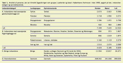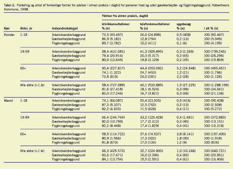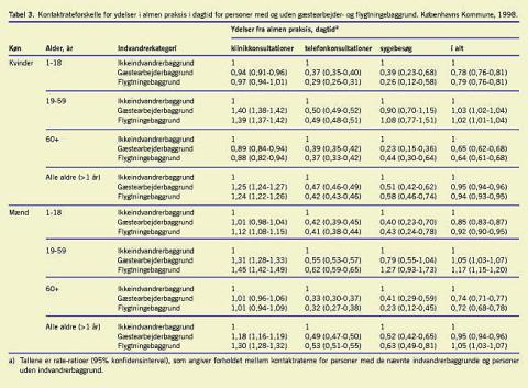 Materiale og metoder: Der blev foretaget en Sygesikringsregisterbaseret undersøgelse af personer bosat i Københavns Kommune i hele 1998, fordelt på statsborgerskab, køn, fødested- og år. Materialet omfattede 2.041.454 ydelser fordelt på 423.201 personer, heraf 5,7% med gæstearbejder- og eller flygtningebaggrund. Analyserne blev foretaget med Poisson-regressionsmodeller.