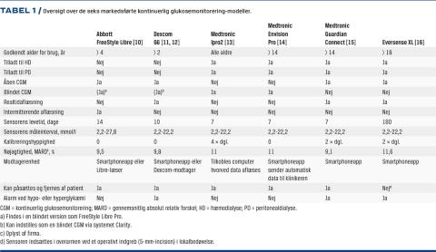 Der findes seks markedsførte CGM-modeller, alle med forskellige styrker og svagheder (Tabel 1) [10-16]. Der findes på nuværende tidspunkt fire modeller, der er godkendt til brug hos patienter i HD og PD (Ipro2, Envision Pro, Guardian Connect og Eversense XL). For de øvrige modeller (Dexcom G6 og FreeStyle Libre) tages der forbehold for, at de ikke er valideret hos dialysepopulationen. For at kunne sammenligne nøjagtigheden af de forskellige systemer benyttes gennemsnitlig absolut relativ forskel (MARD). MARD udregnes som den gennemsnitlige forskel mellem blodglukoseværdier og CGM-værdier. En lav procentsats afspejler derfor en øget nøjagtighed af CGM-værdierne. Det gælder for alle systemer, at MARD er højest ved de laveste blodglukoseværdier, hvorfor det med systemerne er en smule mere usikkert at detektere hypoglykæmi end hyperglykæmi.