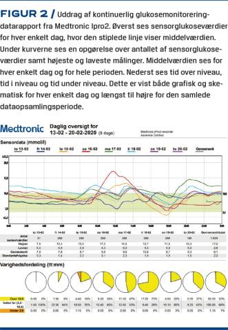 CGM måler sensorglukoseværdier i monitoreringsperioden og derudover beregnes også den glykæmiske variabilitet (risiko for hypo- eller hyperglykæmi) samt tidsfordelingen i hypo-, normo- eller hyperglykæmiske niveauer (Figur 2). Historisk har CGM-målinger været rapporteret meget forskelligt. I 2019 blev der publiceret en international guideline for analyse og behandlingsmål ud fra CGM (Tabel 2) [18]. Ved måling med CGM anbefales mindst 14 dage med målinger 70% af tiden, da dette er påvist at korrelere til middelværdien af HbA1c[18]. Et væsentligt indeksmål er tid i niveau, som er den procentuelle tid, hvor sensorglukoseniveauet ligger på 3,9-10,0 mmol/l (standardindstillingen). Begrebet beskriver den tid, hvor personen har været i et optimalt glukoseniveau. Tilsvarende beskriver tid over niveau og tid under niveau den procentuelle tid, hvor sensorglukoseniveauet har ligget hhv. over og under normalområdet. For patienter med type 1- og type 2-diabetes og kronisk nyrepåvirkning er anbefalingen, at 50% bør være i tid i niveau, < 1% i tid under niveau, og for tid over niveau bør der maksimalt være 50% 10,0 mmol/l og 10% over 13,9 mmol/l [18]. Denne anbefaling omfatter dog ikke specifikt patienter i dialyse, og anbefalingerne for denne patientgruppe vedrørende tid over, under og i niveau er derfor uafklaret. CGM muliggør desuden vurdering af glukoseniveauet om natten, hvor det traditionelt har været svært at identificere hypoglykæmi. Glukosevariabilitet udtrykker fluktuationer i sensorglukoseværdier og beskrives med indeksmålene standarddeviation (SD) og variationskoefficient (CV). CV udregnes ved at dividere SD med middelværdien af sensorglukoseværdierne og et CV ≥ 36% definerer en øget risiko for hypoglykæmi. Hvilken betydning glykæmisk variabilitet har på overlevelse og risiko for senkomplikationer ved diabetes er endnu uafklaret for patienter både med og uden nyresvigt [19]. af glukoseniveauet om natten, hvor det traditionelt har været svært at identificere hypoglykæmi. Glukosevariabilitet udtrykker fluktuationer i sensorglukoseværdier og beskrives med indeksmålene standarddeviation (SD) og variationskoefficient (CV). CV udregnes ved at dividere SD med middelværdien af sensorglukoseværdierne og et CV ≥ 36% definerer en øget risiko for hypoglykæmi. Hvilken betydning glykæmisk variabilitet har på overlevelse og risiko for senkomplikationer ved diabetes er endnu uafklaret for patienter både med og uden nyresvigt [19].