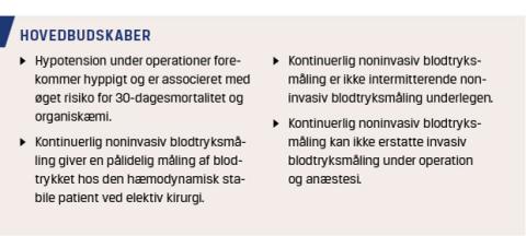 Kontinuerlig NIBP-måling synes at være tilfredsstillende nøjagtig under vedligehold af anæstesi ved den hæmodynamisk stabile patient sammenlignet med IAP-måling [11, 12, 15]. Et problem, der ses ved sammenligning med både IAP- [12] og NIBP-måling [18], er, at nøjagtigheden svinder ved ændring i den vasomotoriske tonus som under induktionen eller ved hypotension [12, 18]. Ved hypotension underestimeres BT-faldets størrelse ved kontinuerlig NIBP-måling, hvilket bør tages med i overvejelserne, hvis der ønskes at intervenere ved dette [12].