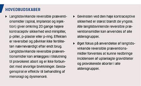 Vi ønsker med denne artikel om langtidsvirkende reversible præventionsmidler at udfordre ordinationspraksis og medvirke til, at disse præventionsformer altid overvejes ved ordination af kontraception. Antallet af provokerede aborter er faldende i Danmark [3], men der er fortsat brug for særligt fokus på gruppen af kvinder under 30 år, hvor incidensen er størst [3]. Langtids-virkende reversible præventionsmidler er mere effektive end andre kontraceptionsformer til reduktion af antallet af uplanlagte graviditeter [4]. Langtidsvirkende reversible præventionsmidler kan anvendes af alle aldersgrupper, også af nullipara, og særligt når fokus er på sikker kontraception [5].