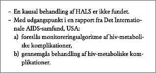 Først inden for de seneste er år er metaboliske komplikationer ved antiretroviral behandling blevet erkendt som et klinisk problem. Med baggrund i nye data foreslås en algoritme til monitorering af hiv-positive patienter. Under behørig hensyntagen til den enkelte patients prognose, kan behandling af metaboliske komplikationer initieres sideløbende med monitorering. Ud over behandling af diabetes mellitus efter sædvanlige retningslinjer samt af hyperlipidæmi med lipidreducerende midler er der imidlertid endnu ikke evidens for betydelige behandlingstiltag. Der er et uændret stort behov for stu-dier, hvor man prospektivt belyser HALS og de med HALS og HAART relaterede metaboliske komplikationer.
