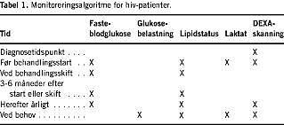 Indtil årtusindskiftet havde hverken billeddiagnostiske metoder (CT, MR og DEXA), bioimpedans, UL eller antropometri endnu vist tilstrækkelig sensitivitet, specificitet eller prædiktiv værdi til at kunne anbefales til monitorering, formentlig betinget af en manglende konsensus om diagnostiske krite-rier samt et publikationsbias, hvor man de første år har fokuseret meget på PI som årsag til den ændrede fedtfordeling. I det netop publicerede LD Case Definition Study [2] og endnu upublicerede data anbefaler man objektivisering i form af billeddiagnostisk monitorering. Metodevalg og monitoreringshyppighed vil afhænge af lokale forhold. Vi foreslår på baggrund af litteraturgennemgang og egne data, at man inddrager DEXA-helkropsskanninger ved diagnosetidspunkt, ved start af HAART og herefter en gang årligt (Tabel 1 ).