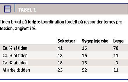 Knap halvdelen af afdelingerne havde én forløbskoordinator, 36% havde to eller flere, mens 14% havde lagt funktionen ind i eksisterende stillinger. Den største faggruppe var sygeplejersker med 62%, herefter fulgte sekretærer/øvrige med 26% og læger med 12%. Andelen af arbejdstid, der blev brugt på forløbskoordination viste stor spredning faggrupperne imellem (Tabel 1). 46% deltog som regel eller altid i MDT-konferencer, mens 42% sjældent eller aldrig deltog.