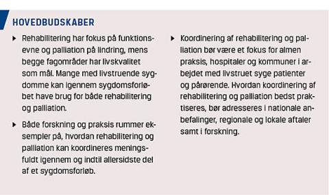 There is an increased focus on coordinating rehabilitation and palliative care (CRPC). A systematic Danish literature review on CRPC highlights the following: the main arguments and recommendations for such a coordination, that CRPC might be meaningful for patients throughout the disease trajectory and until the very end of it, that there is a lack of evidence-based research in this area, and that there is a lot of structural, organizational and professional challenges in securing CRPC.