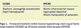 Summary Coronary artery bypass surgery without the use of a heart-lung machine Ugeskr Læger 2005;167:2037-2041. Within recent years, off-pump coronary artery bypass (OPCAB) has gained renewed interest. Prospective, controlled, randomised trials comparing OPCAB with conventional coronary artery bypass using a heart-lung machine have documented a lower rate of minor complications such as postoperative bleeding, neurocognitive deficits, atrial fibrillation and infections. Furthermore, biochemical analyses show less myocardial and renal injury and less inflammatory reaction. Larger randomised trials are needed to determine the impact of OPCAB on perioperative death, stroke and myocardial infarction.