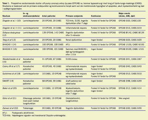 En systematisk gennemgang af litteraturen er foretaget ved en MEDLINE- og Cochrane-søgning ved brug af søgeordene »OPCAB «, »off-pump «, »offpump « OR »MIDCAB« med begrænsning til engelsksprogede artikler udført den 23. juni 2003. De i dette arbejde refererede artikler samt oversigtsartikler er efterset for yderligere litteratur. På basis af abstrakter fra i alt 1.116 hit udvalgtes de prospektive, randomiserede undersøgelser til nærmere vurdering, ligesom de største prospektive og retrospektive opgørelser af uselekterede patienter og undergrupper af patienter med særlig høj operativ risiko blev gennemgået. Korrespondancer, kasuistikker, dyreeksperimentelle og in vitro-eksperimentelle studier og studier, der kun var publiceret i abstraktform, blev ekskluderet.