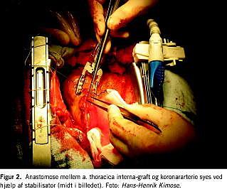 Også OPCAB indledes med sternotomi og perikardiotomi. Det område, hvor anastomosen skal anlægges, stabiliseres med sugekopper, så bevægelserne begrænses under syningen (Figur 2 ). Der opnås adgang til hjertets bagside ved anlæggelse af suturer anbragt dybt i perikardiet, hvorfra de støtter hjertet og/eller ved anbringelse af en sugekop over apex, som muliggør mobilisering af hj ertet. Et blodtomt felt sikres enten ved afklemning af karret med tourniquet, ved indføring af en rørformet shunt i karret gennem arteriotomien eller ved en kombination af de to teknikker. Herefter syes de distale anastomoser. Endelig syes de proksimale anastomoser under dække af sidetang.