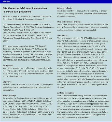 <li>Kaner EF, Beyer F, Dickinson HO et al. Effectiveness of brief alcohol interventions in primary care populations. Cochrane Database Syst Rev 2007: Issue 2. Art. No.: CD004148. DOI: 10.1002/14651858.CD004148.pub3.</li>