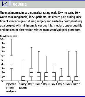 I alt 75 patienter, der var opereret med PP i perioden fra 2007 til 2009, blev inkluderet. Medianalderen var 30 år (spændvidde 15-64 år), og 57 (76%) var mænd. Operationen blev foretaget under lokalbedøvelse i 73 tilfælde. Der blev foretaget mediant to (spændvidde 1-5) SE. Postoperativ blødning, infektion, manglende opheling samt recidiv ved klinisk undersøgelse blev registreret. Patienter, der var opereret i 2009, blev inkluderet i smertedelen af studiet. Den maksimale smerte (målt ved numerical rating scale ) blev registreret under proceduren samt dagligt ved telefoninterview i en uge postoperativt. Indtag af analgetika samt evnen til at genoptage arbejde blev registreret.