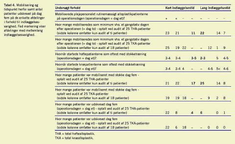 Mobilisering foregik allerede på operationsdagen på de to afdelinger med kortest indlæggelsesvarighed, og både mobilisering til gangstativ og til stokke foregik tidligere og i større omfang på afdelinger med kort indlæggelsesvarighed end på afdelinger med længere indlæggelsesvarighed, i overensstemmelse med at dette mindsker muskelfunktionstab og risiko for tromboemboliske komplikationer samt mindsker sygerollen.