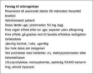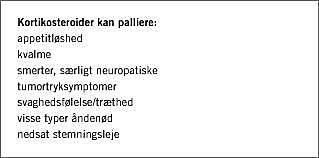 Anvendelse af kortikosteroider (KS) for at lindre belastende symptomer hos patienter med fremskreden kræftsygdom er ikke nogen nyhed. Behandlingen har i flere årtier været kendt for at kunne afhjælpe anoreksi, kvalme, smerter, træthed, tumortryksymptomer, almen sygdomsfølelse og nedsat stemningsleje. Der hersker imidlertid tvivl om, hvorvidt dette er tilstrækkelig evidensbaseret, og der er usikkerhed om indi-kationer, timing, optimal dosering, varighed af effekten og balancen effekt/bivirkninger. Anvendelsen i Danmark er derfor sporadisk og lidet systematisk. Der er ingen registreret indikation.