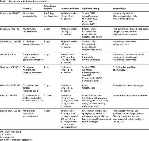 Ved søgning i MEDLINE (søgeord: corticosteroids, prednisolone, dexamethasone, palliative care, terminal care, symptom control, painogcancer ) suppleret med manuel søgning fandtes otte randomiserede, kontrollerede undersøgelser (RCT), to prospektive, ikkekontrollerede og en retrospektiv undersøgelse. Dertil kommer et antal oversigter, specialartikler og pædagogiske tekster. De fundne artikler er indordnet i evidenskategorierne 1-4 i henhold til Ugeskriftets manuskriptvejledning.