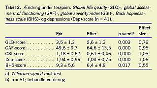 Patienterne havde ret høje forventninger til terapien (4,0 ± 1,4) og vurderede deres udbytte som stort (4,5 ± 1,2). Der var en signifikant positiv korrelation mellem ændret Dep-score og GLQ-score (Pearson correlation : 0,427; p = 0,007) og en moderat effekt på oplevet livskvalitet og håbløshed. Ændring fra start på til afslutning af behandlingen i psykopatologiske symptomer, depressionssymptomer og funktionsniveau var stor (Tabel 2 ).