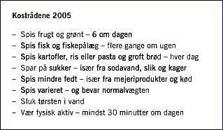 <li>Astrup A, Andersen NL, Stender S et al. Kostrådene 2005. Publ. nr. 36. København: Ernæringsrådet, 2005.</li>