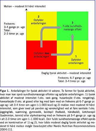 I de nye kostråd anbefales fysisk aktivitet, og der anbefales fysisk aktivitet i mindst 30 minutter om dagen. I undersøgelser er det fundet, at den største sundhedsfremmende effekt ses hos folk, som går fra at være helt inaktive til at være moderat fysisk aktive 30 minutter om dagen. Det skal fremhæves, at 30 minutters moderat fysisk aktivitet pr. dag ikke giver den fulde sundhedsmæssige effekt (Figur 1 ), og at forebyggelse af vægtøgning hos disponerede personer kræver 45-60 minutter dagligt.