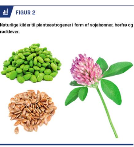 Der findes generelt tre typer PØ: isoflavonoider (IF), lignaner og coumestaner (Figur 1) [2]. Lignaner findes i de fleste fiberrige fødevarer såsom frø, fuldkorn og grove grøntsager og indgår dermed i den daglige kost. IF findes primært i sojabønner både i ukonjugeret form (aglykoner) og som glykosidkonjugater. Kosttilskud med PØ er udbredte. Ud over kosttilskud baseret på hørfrø (lignaner) og soja, sælges der også kosttilskud baseret på rødkløver (Figur 2). Rødkløver indeholder IF og i mindre grad coumestaner. Mængden af PØ varierer enormt mellem forskellige fødevarer, men indholdet i de fødevarer med højest koncentration af IF (f.eks. soyabønnepasta) svarer til indholdet i kosttilskud (ca. 60 mg pr. servering/dagsdosis). Da de færreste spiser dette dagligt, er det generelt sådan, at mængden af PØ i kosttilskud overskrider, hvad man normalt vil spise sig til i kosten.