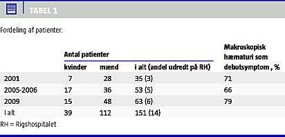 Materialet omfatter en retrospektiv journalgennemgang af 151 patienter, som i løbet af tre tidsperioder blev cystektomeret for blærekræft på Urologisk Klinik D, Rigshospitalet, se Tabel 1 . Perioderne lå før og efter indførelse af ventetidsgaranti for formodede kræftpatienter i 2001 [2] og dels efter indførelsen af kræftpakkeforløb i slutningen af 2008 [1]. Patienterne i undersøgelsen fordeler sig med 73% mænd og 27% kvinder, og de havde på operationstidspunktet en gennemsnitsalder på 62,2 år. Journalerne fra alle patienter, som blev cystektomeret i 2001 og fra september 2005 til december 2006 samt i 2009, er gennemgået. Patienter der blev cystektomeret af anden årsag end blærekræft samt patienter, der havde modtaget kemo- og strålebehandling, blev ekskluderet.