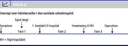 Journalerne er gennemgået systematisk med henblik på at fastslå følgende tidsintervaller: Intervallet fra symptomdebut til første kontakt på primærafdeling (Fase 1). Udredningstiden fra første kontakt på primærafdeling til modtagelse af henvisning på Urologisk Klinik D, Rigshospitalet (RH) (Fase 2). Intervallet fra modtagelse af henvisning til cystektomi (Fase 3), se Figur 1 .