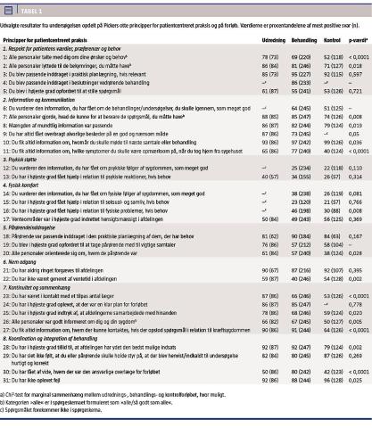 Vejle Sygehus er udpeget af Region Syddanmark til at være specialsygehus med særligt fokus på kræftområdet. I 2011 besluttede direktion og ledelseskreds at gennemføre den femårige strategi- og programplan »Vejle Sygehus – Patienternes Kræftsygehus« [1]. Målet er at udvikle sygehuset til et moderne, patientcentreret og specialiseret kræftsygehus, der sætter patientens behov i centrum. For at nå denne målsætning er det vigtigt at kende til patienternes oplevelser og behov i de forskellige faser af kræftforløbet og på de enkelte afdelinger [2]. Et af de første initiativer i forbindelse med programplanen var at udføre en baseline-måling blandt patienterne med kræft for at få indblik i, om de oplever sygehusets indsats som patientcentreret. Med udgangspunkt i resultaterne belyses det i denne artikel, om patienterne med kræft oplever en patientcentreret indsats i henholdsvis udrednings-, behandlings- og kontrolforløbet. Forståelsen af patientcentreret praksis tager afsæt i et internationalt forskningssamarbejde mellem Picker Institute og Harvard Medical School, som har udviklet et koncept med otte principper, der af patienterne selv opfattes som centrale i et optimalt patientforløb [3]. I denne artikel tages der udgangspunkt i den danske oversættelse af principperne, som er: 1) respekt for patientens værdier, præferencer og behov, 2) information og kommunikation, 3) psykisk støtte, 4) fysisk komfort, 5) pårørendeinddragelse, 6) nem adgang,