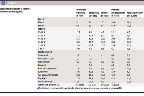 Undersøgelsen er en tværsnitsundersøgelse, hvor forskellige patienter har besvaret spørgeskemaet under henholdsvis udredning, behandling og kontrol. Respondenterne adskiller sig især, hvad angår fordelingen af kræftsygdom (Tabel 2). Betydningen af dette er efterfølgende undersøgt med en logistisk regressionsanalyse. Denne subanalyse viste, at de fundne signifikante forskelle mellem forløbsdelene stadig kunne påvises