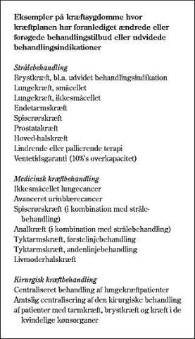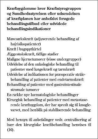 I boksen er det beskrevet, hvilke specifikke behandlinger som Kræftstyregruppen anbefalede bliver indført herhjemme i forbindelse med udsendelsen af kræftplanen, og hvilke behandlinger der efterfølgende er blevet anbefalet. Det bør fremhæves, at der siden udsendelsen af kræftplanen er sket en markant ressourcetilførsel fra såvel de centrale som de decentrale sundhedsmyndigheder, de faglige miljøer og personalet på de involverede sygehusafdelinger, således at det har været muligt stort set at iværksætte alle de nye anbefalinger, der blev udmeldt af Kræftstyregruppen, allerede inden for 2-3 år, hvor Kræftstyregruppen opererede med en 5-års-tidshorisont. Der vil også i de kommende år være behov for en markant ressourcetilførsel til kræftbehandling i Danmark, så personaleressourcerne og de fysiske rammer tilpasses den markant øgede behandlingsaktivitet.