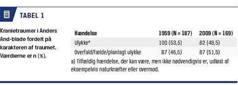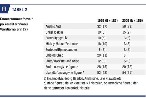I de to undersøgte årgange optrådte der numerisk stort set lige mange kranietraumer (Tabel 1), men antallet faldt fra et traume pr. ti sider i 1959 til et traume pr. 20 sider i 2009, dog er antallet af kranietraumer pr. udgivet nummer ikke signifikant forskelligt (3,6 og 3,25). Kranietraumerne fordelte sig i begge årgange ved 50% som forårsaget af ulykker og 50% forårsaget af overfald. I Tabel 2 ses, hvilke navngivne figurer der pådrog sig traumerne. Anders And figurerer hyppigt på listen over tilskadekomne, og hans andel af traumerne steg fra 17% til 33%. Det er ikke nødvendigvis et udtryk for »andeforfølgelse«, men skyldes det faktum, at andelen af historier, hvori Anders And optræder, blev næsten fordoblet fra 132 i 1959 til 245 i 2009.