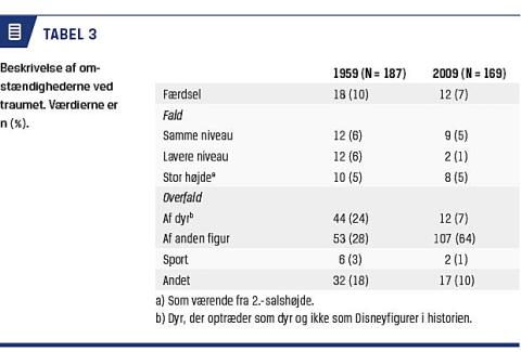 I Tabel 3 beskrives traumesituationen. Både antallet af færdselsulykker og faldulykker er reduceret i perioden. I 1959 var der signifikant flere dyreangreb (det vil sige dyr, der optræder som dyr og ikke som reelle Disneyfigurer i historien), hvorimod den interpersonelle vold fordobledes, idet antallet af overfald af en anden, navngiven, figur steg fra 53 til 107 i perioden.
