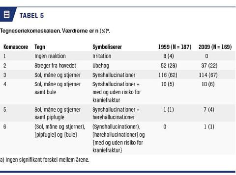 For nærmere at kunne beskrive graden af kranietraume brugte vi dels en forenklet udgave af Glasgow komaskala (GCS) [3], dels udviklede vi en tegneserierelateret komaskala, tegneseriekomaskala (TCS). TCS er en sekstrins skala, hvor man ud fra den visuelle beskrivelse af figuren karakteriserer kranietraumet. Traumet er i TCS defineret ud fra den visuelle angivelse og tilstedeværelsen af henholdsvis visuelle og auditive hallucinationer (sol, måne og stjerner samt pipfugle) samt tilstedeværelse af en eventuel bule som tegn på et noget voldsommere traume med risiko for kraniefraktur.