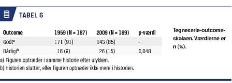 I 1959 var hovedparten af kranietraumerne (134 af 187, 72%) resultatet af en ulykke, hvilket er signifikant mere end i 2009, hvor det var 42% (p < 0,001). Sværhedsgraden af traumerne beskrevet ved GCS og TCS var uændret i perioden (Tabel 4 og Tabel 5), hvorimod der netop er signifikant forskel på outcome, idet figurerne i 2009 havde et dårligere outcome (p = 0,048) (Tabel 6). Om sidstnævnte er et reelt fund eller et udtryk for, hvornår kranietraumerne forekommer i historien (der kan have været flere situationer, hvor historien endte med traumet), er ikke muligt at verificere.