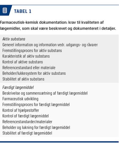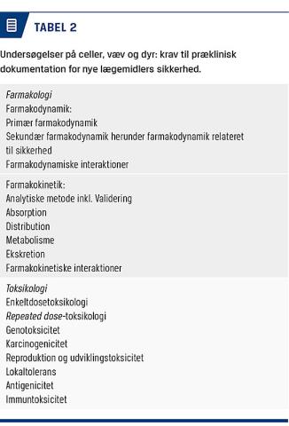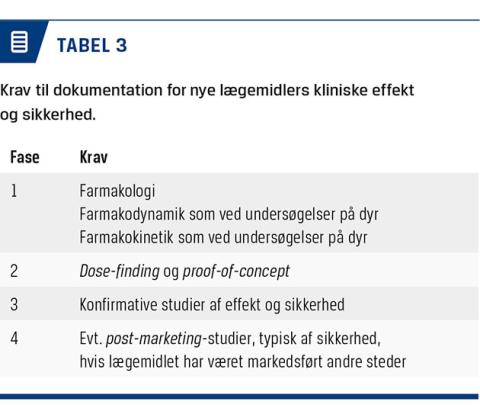 For at få ret til at sælge et stof som et lægemiddel kræves det, at der foreligger evidens for kvalitet, sikkerhed og effekt [1]. For så vidt angår »kvalitet« fokuseres her på, at lægemidlet indeholder det, som det skal (dvs. i den påtænkte mængde/koncentration), og at urenheder/tilsætningsstoffer er velbeskrevne og sikre og ligger inden for de fastlagte rammer (Tabel 1). Formålet er at sørge for, at patient og læge kan være sikre på, at lægemidlet indeholder den rigtige mængde fra gang til gang, og at der ikke er sundhedsskadelige biprodukter i lægemidlet. Dokumentation af lægemidlets sikkerhed og effekt sker gennem undersøgelser, først på dyr og senere hos mennesker. Undersøgelserne på dyr skal afdække såvel akut som kronisk toksicitet, herunder mulige skadelige virkninger på arvemassen og reproduktionen (Tabel 2). Om end undersøgelser på dyr aldrig kan give fuldstændig sikkerhed for, at lægemidlet er sikkert at bruge hos mennesker, er det nødvendigt at udelukke alvorlige skadelige effekter, inden lægemidlet anvendes til mennesker. Sikkerheden hos mennesker skal også beskrives, men selv om moderne kliniske udviklingsprogrammer oftest inkluderer mere end 2.000 patienter (oftest undersøgt i forbindelse med studier af effekten, se nedenfor), er en population af den størrelse ikke tilstrækkelig til at udelukke sjældnere bivirkninger. Indrapportering af bivirkninger er derfor afgørende, hvis sjældnere bivirkninger skal opdages, efter at lægemidlet er taget i brug. Effekten af lægemidlet undersøges i en række kliniske studier, typisk inddelt i faser fra et til fire (Tabel 3), hvor man først hos raske forsøgspersoner undersøger, om lægemidlet kan tåles (fase 1), og efterfølgende søger at reproducere dette i den tiltænkte patientpopulation, herunder bestemmer den optimale dosis og sandsynliggør, at det vil virke mod den tiltænkte sygdom (fase 2). Til slut bekræftes effekt og sikkerhed i en større patientpopulation, de såkaldte fase 3-konfirmative studier.