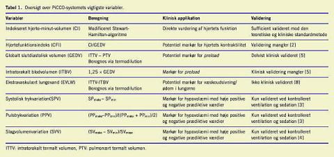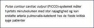 I det efterfølgende beskrives et relativt nyt monitoreringssystem, pulse contour cardiac output (PiCCO,Pulsion Medical Systems, München, Tyskland), som synes at kunne honorere ovennævnte krav.